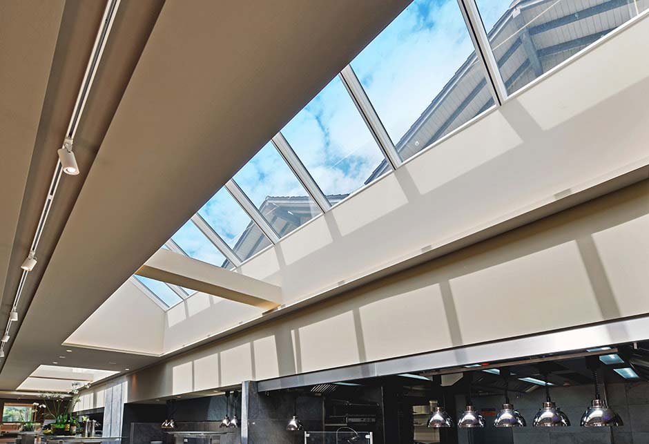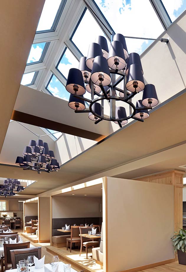 - Cztery pasma świetlne dwuspadowe, każde o długości ok. 8 m i łącznej powierzchni prawie 77 m², zmieniły wnętrze restauracji w wypełnioną światłem, relaksującą przestrzeń dla gości.