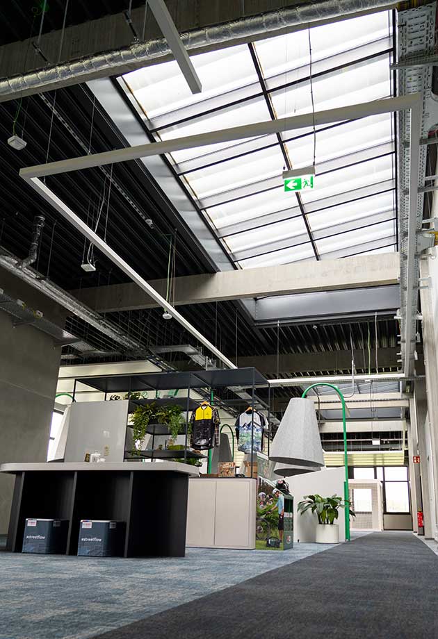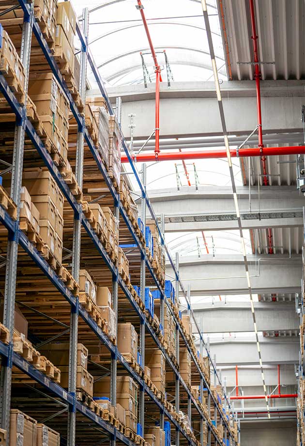 W obszarach logistycznych i magazynowych wymagania dotyczące izolacji cieplnej są naturalnie mniejsze. Poszukiwano więc rozwiązania, które z jednej strony zapewni dużą powierzchnię doświetlenia, a z drugiej spełni wszystkie normy przeciwpożarowe. Zdecydowano się na cztery pasma świetlne Vario-Therm, gwarantujące naturalne oświetlenie bez efektu olśnienia i cieni w całej hali. W razie pożaru zintegrowane podwójne klapy, sterowane elektrycznie za pomocą napędów 24 V, umożliwiają skuteczne odprowadzanie dymu i ciepła.