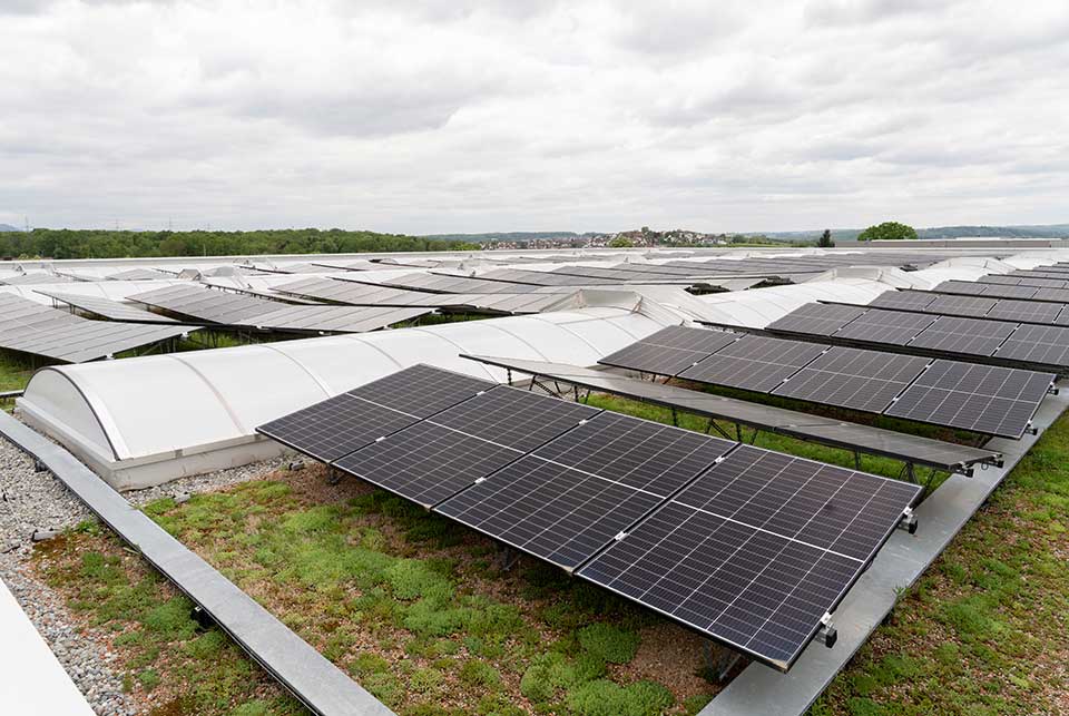 Prezes Jochen Hoppe wyjaśnia, dlaczego zdecydowano się na dodatkowe oświetlenie przez dach: „Ze względu na ścianę przeciwpożarową oddzielającą magazyny akumulatorów litowo-jonowych stanęliśmy przed wyzwaniem: pomieszczenia biurowe mają okna tylko z jednej strony, przy głębokości aż 18 metrów. Aby zapewnić odpowiednią ilość światła dziennego, zaprojektowaliśmy duże świetliki wyposażone w stałe elementy zaciemniające.” Elastyczna konstrukcja zapewnia dziś jasne miejsca pracy nawet w głębi pomieszczenia dzięki kilku dużym otworom dachowym.