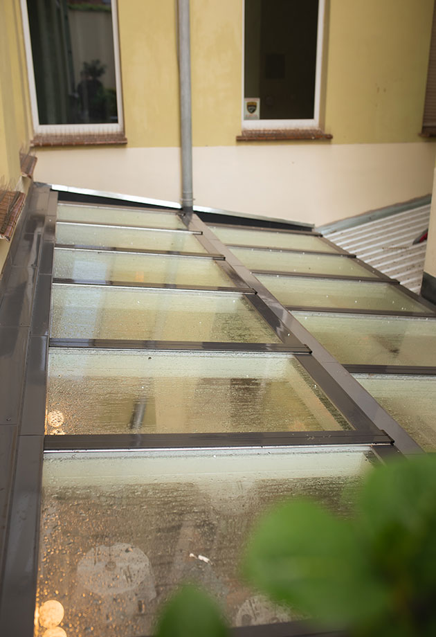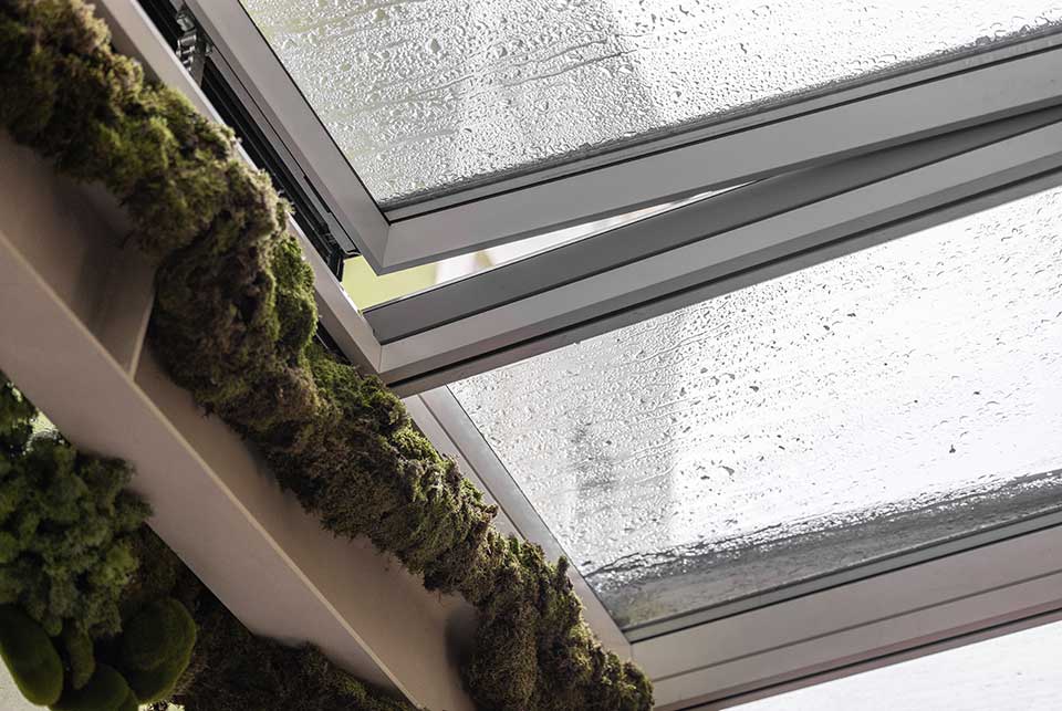 Mimo że na zewnątrz bywa pochmurnie i deszczowo, do wnętrza wciąż wpada naturalne światło dzienne, a dzięki otwieranym modułom możliwa jest ciągła cyrkulacja świeżego powietrza. To rozwiązanie nie tylko wspiera komfort przebywania w przestrzeni restauracyjnej, ale również podkreśla zrównoważony i nowoczesny charakter całego projektu. W sumie do wykonania szklanego dachu wykorzystano 12 modułów, z czego połowa pełni funkcję wentylacyjną. Takie rozwiązanie spełniało wszystkie wymagania klienta: zapewnia szczelność konstrukcji, maksymalizuje doświetlenie wnętrza oraz gwarantuje odpowiednią wentylację poprzez sterowane, otwierane elementy.