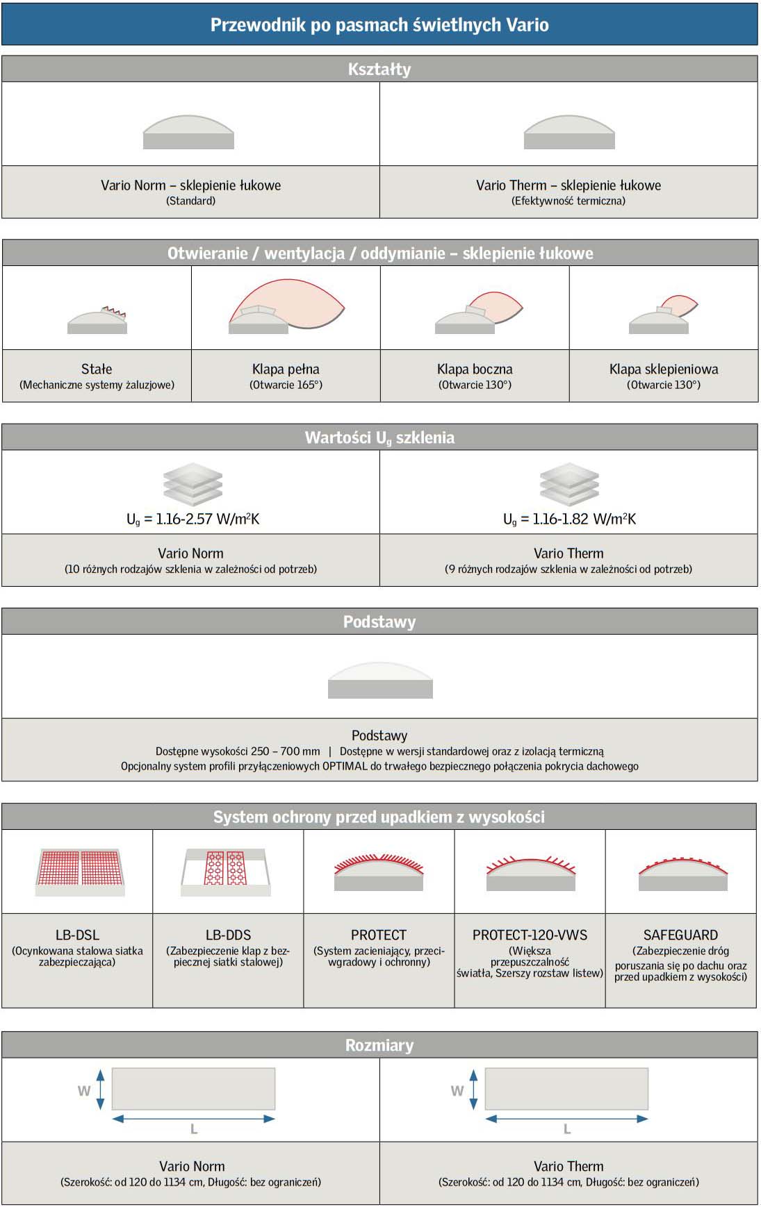 Świetliki pasmowe Vario są odporne na warunki atmosferyczne, wydajne termicznie i można je w pełni dostosować do konkretnych wymagań projektowych i użytkowych. Dostarczane są w postaci prefabrykowanej, aby zaoszczędzić czas i koszty montażu oraz umożliwić szybkie zamknięcie otworów budowlanych i rozpoczęcie prac wewnętrznych.